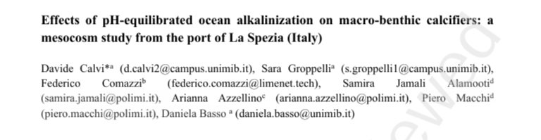 Davide Calvi, Sara Groppelli, Federico Comazzi, Samira Jamali Alamooti, Arianna Azzellino, Piero Macchi, Daniela Basso. Effects of pH-equilibrated ocean alkalinization on macro-benthic calcifiers: a mesocosm study from the port of La Spezia (Italy) (Paper currently under peer review).
